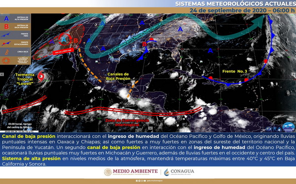 24/09/2020/ –Península de Yucatán: Cielo despejado por la mañana e incremento de nublados por la tarde. Lluvias puntuales muy fuertes en Campeche además de fuertes en Yucatán y Quintana Roo, todas acompañadas de descargas eléctricas. Ambiente muy caluroso durante el día. Viento del este y noreste de 20 a 30 km/h.