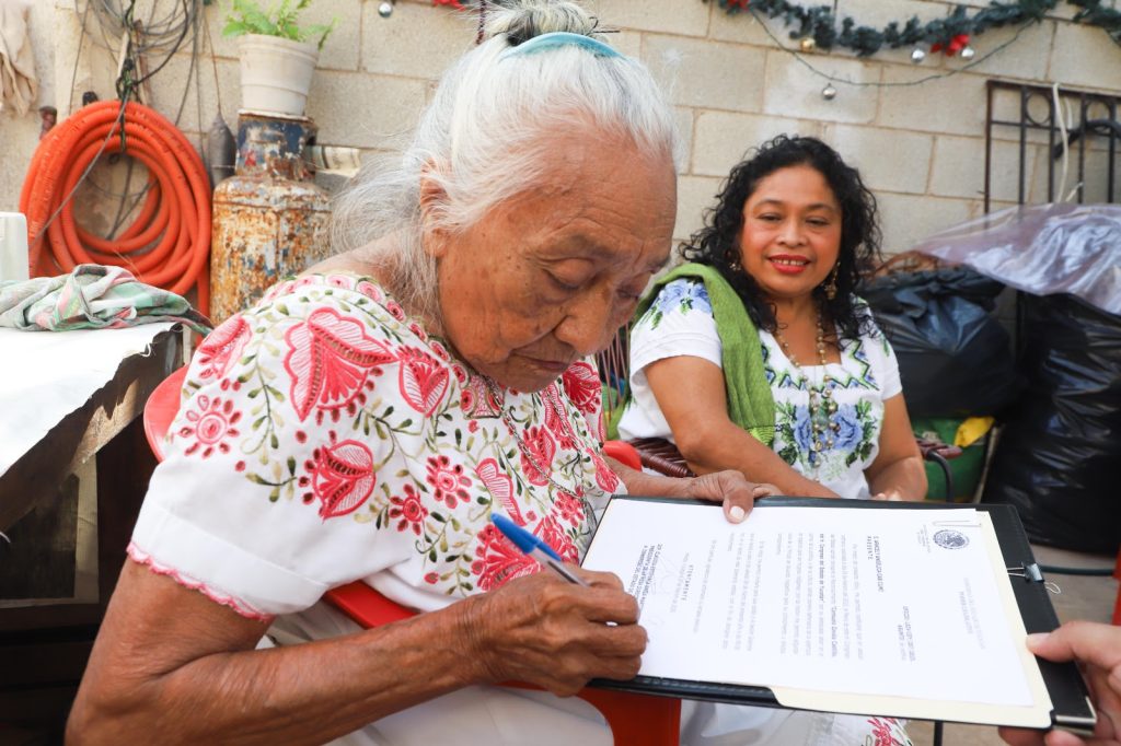 A sus 92 años, Aracely Angélica de Jesús Cab Cumí agradeció a la diputada Pat Dzul y al Congreso del Estado por haberla designado como recipiendaria del mérito, el cual reconoce a las mujeres que por décadas han alzado la voz para defender sus ideales.