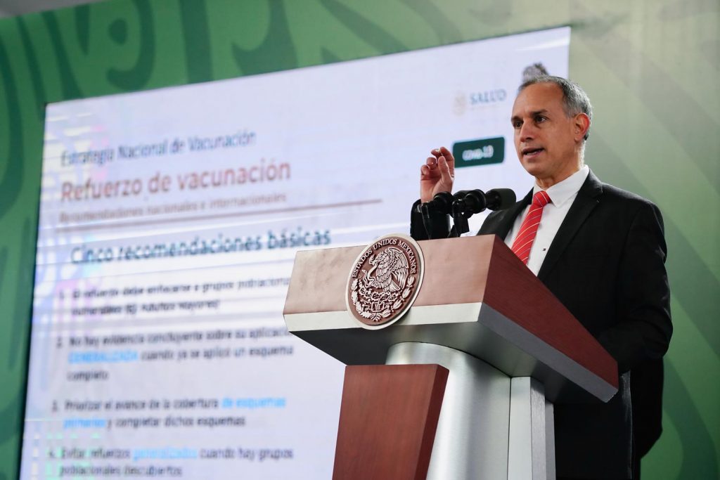 El subsecretario de Prevención y Promoción de la Salud, Hugo López-Gatell Ramírez, precisó que, por recomendación de la Organización Mundial de la Salud (OMS), la tercera dosis que se aplicará a todas las personas adultas mayores del país será de la vacuna AstraZeneca aunque su esquema corresponda a otra farmacéutica.