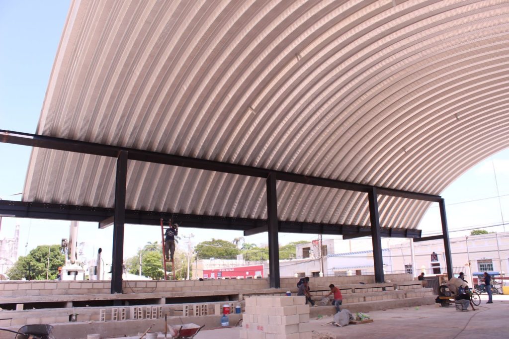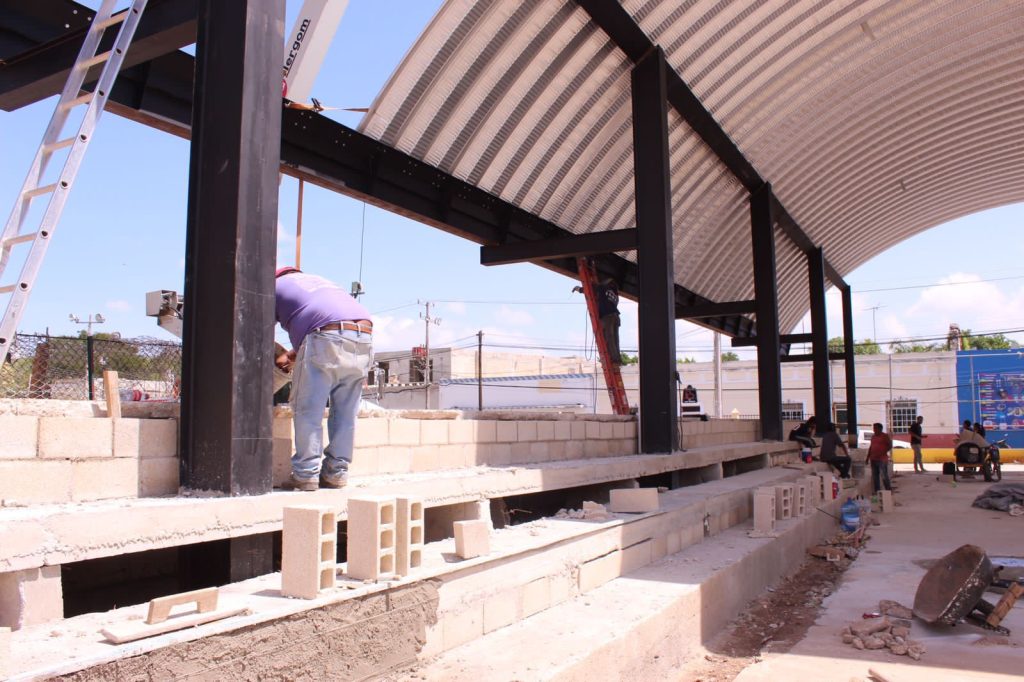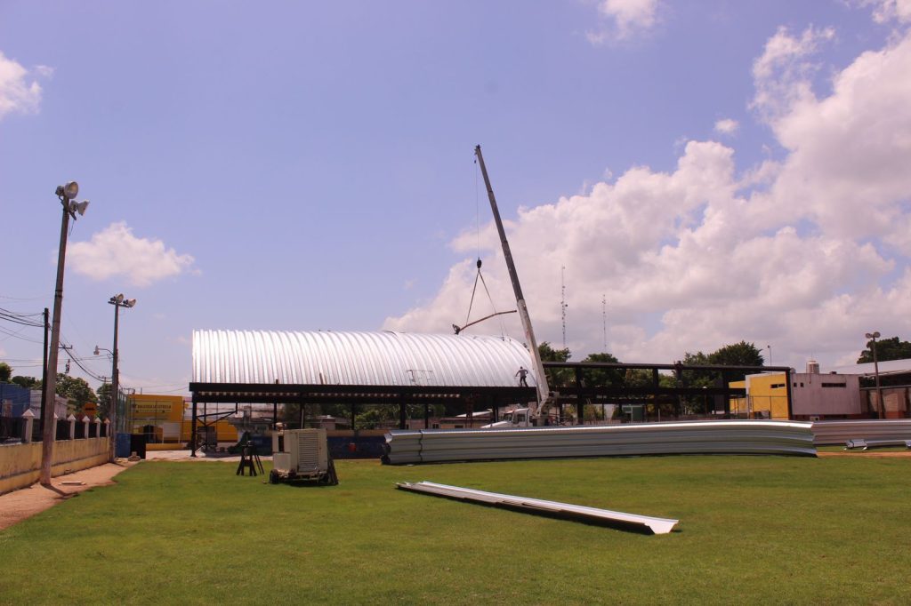 UMÁN, YUCATÁN, 08/07/2023. —La construcción de un techo de un espacio multideportivo, tienen un avance del 70 por ciento, y que se encuentra a un costado del campo “Solidaridad”, en el municipio de Umán y que funcionará como la “Casa del Deportista Umanense”.