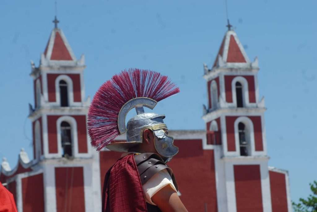 BACA, YUCATÁN, 18/04/2025. —Con 40 grados de temperatura fue el escenario del viacrucis viviente en la villa de Baca, en Yucatán, con una suma interpretación de dramatismo, que inició en el Palacio Municipal.