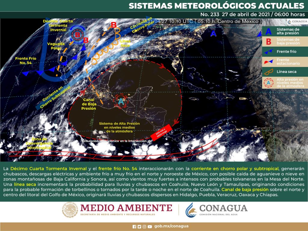 27/04/2021. –Península de Yucatán: Cielo parcialmente nublado y sin lluvia en la región. Ambiente templado por la mañana y muy caluroso por la tarde. Viento del sureste de 10 a 25 km/h en la región, con rachas de 60 km/h en Campeche y Yucatán y de 50 a 60 km/h en Quintana Roo.