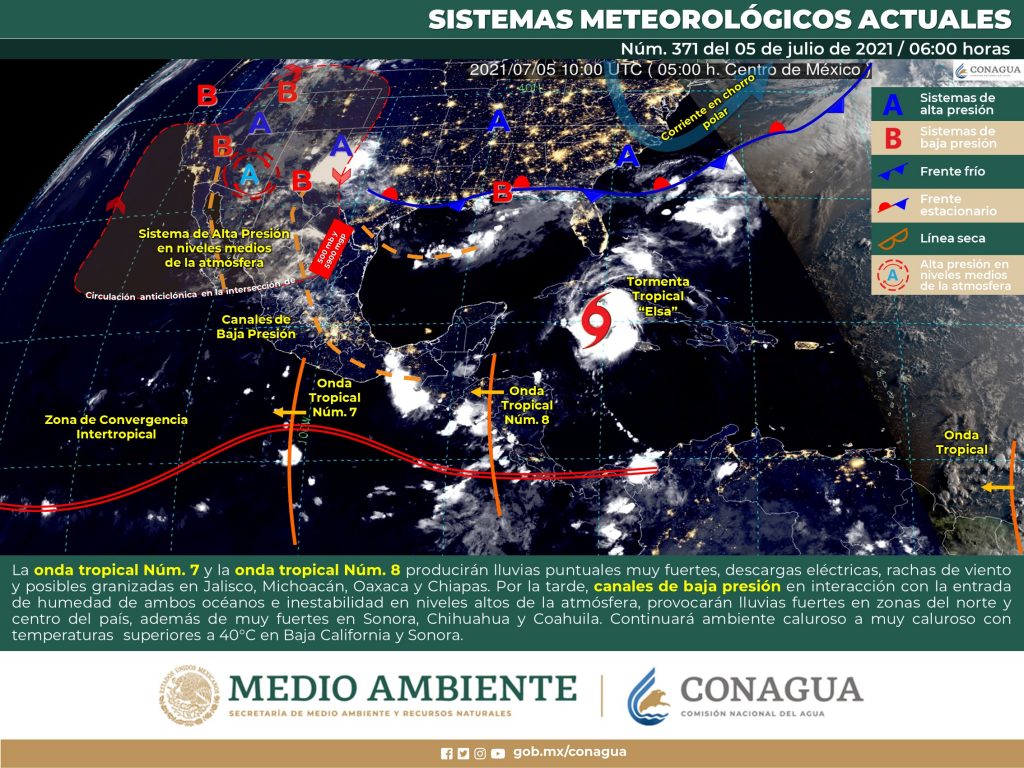 05/07/2021. —Península de Yucatán: Cielo medio nublado con intervalos de chubascos y descargas eléctricas en Campeche, Yucatán y Quintana Roo. Ambiente fresco por la mañana y caluroso por la tarde. Viento de componente este de 20 a 35 km/h con rachas de 45 km/h en zonas costeras.