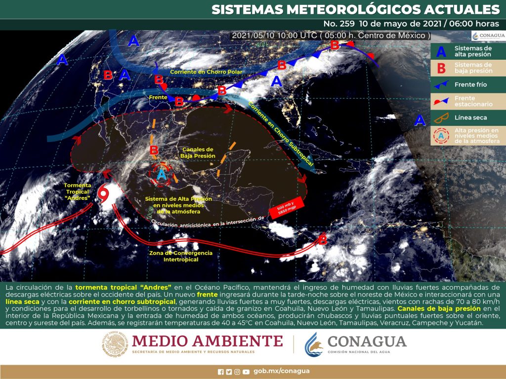 10/05/2021. –Península de Yucatán: Cielo parcialmente nublado por la tarde sin lluvia en la región. Ambiente templado por la mañana y caluroso a muy caluroso por la tarde. Viento del sureste de 15 a 30 km/h con rachas de 50 a 60 km/h en Campeche y Yucatán.