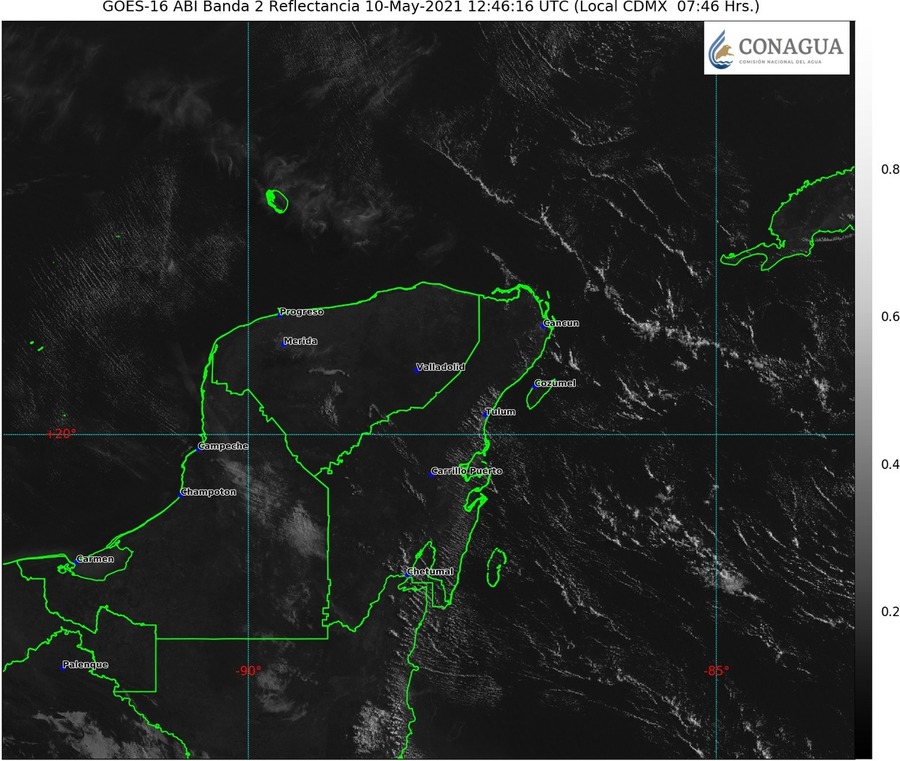 10/05/2021. –Península de Yucatán: Cielo parcialmente nublado por la tarde sin lluvia en la región. Ambiente templado por la mañana y caluroso a muy caluroso por la tarde. Viento del sureste de 15 a 30 km/h con rachas de 50 a 60 km/h en Campeche y Yucatán.