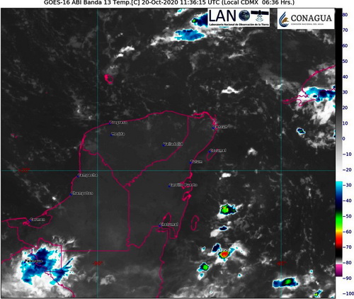 20/10/2020.- Este día, la Onda Tropical No. 42 se desplazará sobre la Península de Yucatán y gradualmente sobre el sureste del país, interaccionará con una zona de baja presión con probabilidad para desarrollo ciclónico que se localizará frente a las costas de Quintana Roo, generando lluvias puntuales fuertes, descargas eléctricas y rachas de viento sobre la Península de Yucatán, además de Tabasco, Chiapas, Veracruz y Oaxaca.