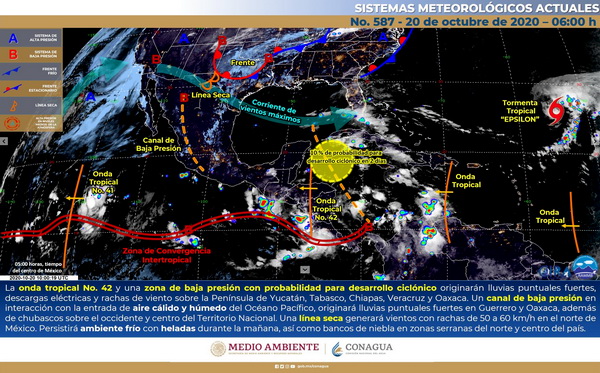 20/10/2020.- Este día, la Onda Tropical No. 42 se desplazará sobre la Península de Yucatán y gradualmente sobre el sureste del país, interaccionará con una zona de baja presión con probabilidad para desarrollo ciclónico que se localizará frente a las costas de Quintana Roo, generando lluvias puntuales fuertes, descargas eléctricas y rachas de viento sobre la Península de Yucatán, además de Tabasco, Chiapas, Veracruz y Oaxaca.