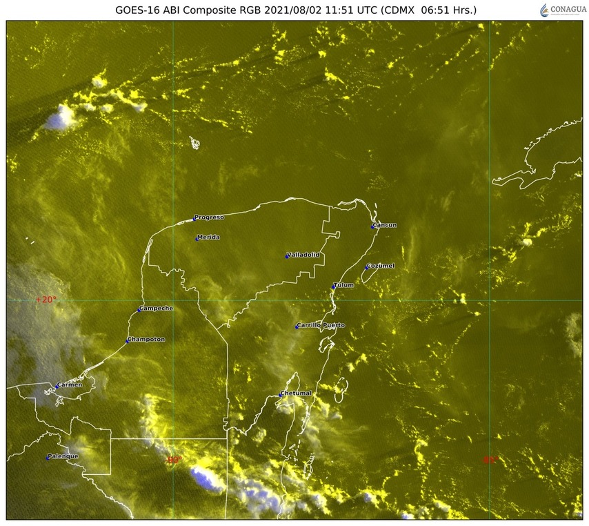 02/08/2021. –Península de Yucatán: Cielo parcialmente nublado durante el día, por la tarde incrementará la nubosidad y se pronostican lluvias y chubascos con descargas eléctricas en la región. Ambiente templado por la mañana y caluroso por la tarde. Viento del este de 10 a 25 km/h con rachas de 40 km/h en costas de la región.