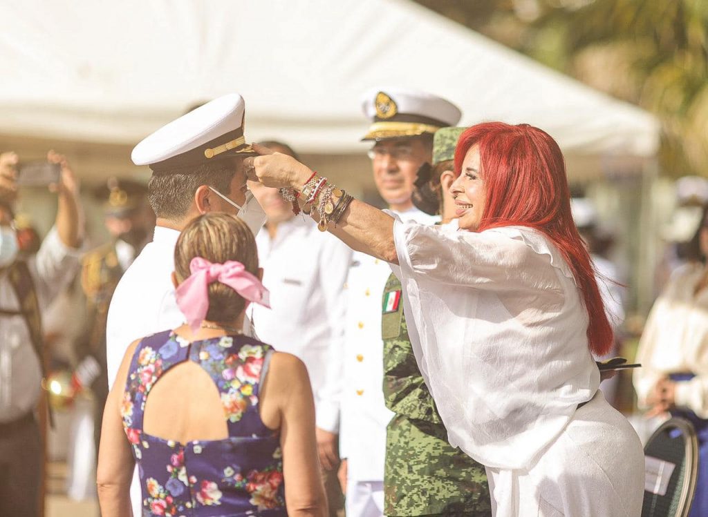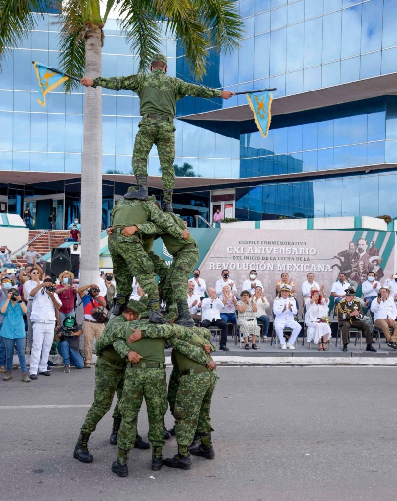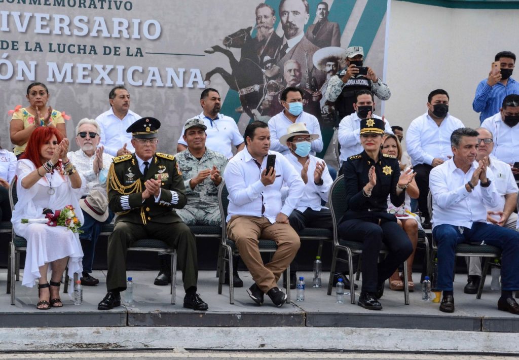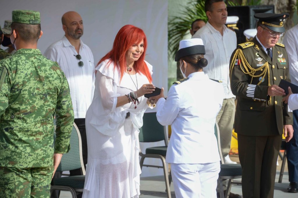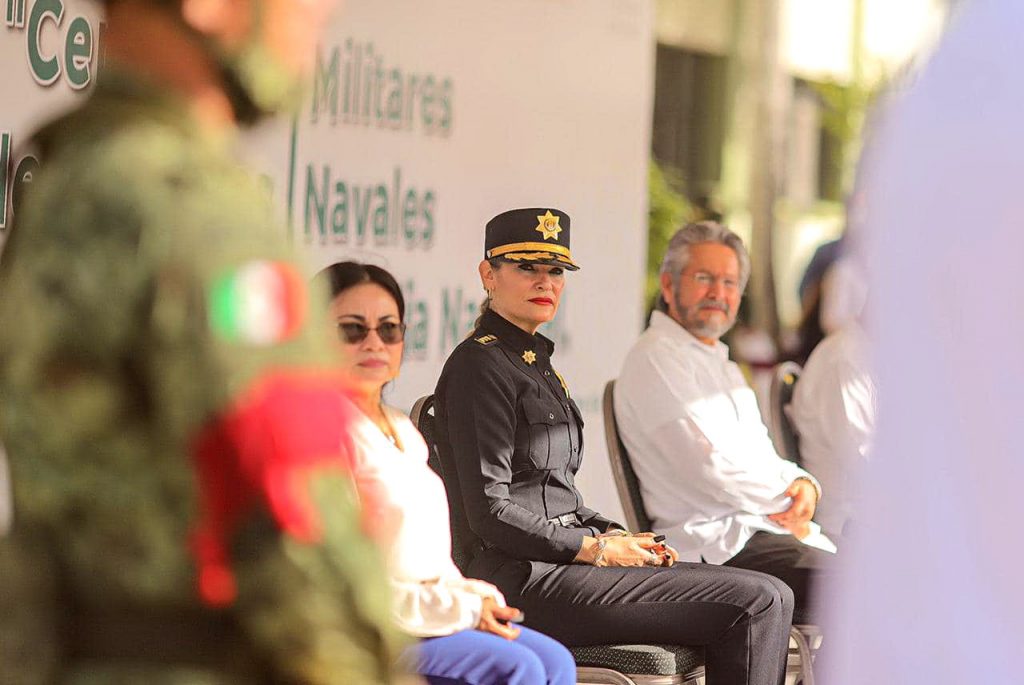 En el evento en el que se rindieron los honores a la Bandera y en que se ejecutó el toque militar “Tres de Diana” y el Desfile de Honor, la Gobernadora estuvo acompañada de los comandantes de la 33ª Zona Militar, Hernán Cortés Hernández, y de la Tercera Región Naval, Héctor Capetillo López, y de la titular de la Secretaría de Seguridad Pública, Marcela Muñoz Martínez.