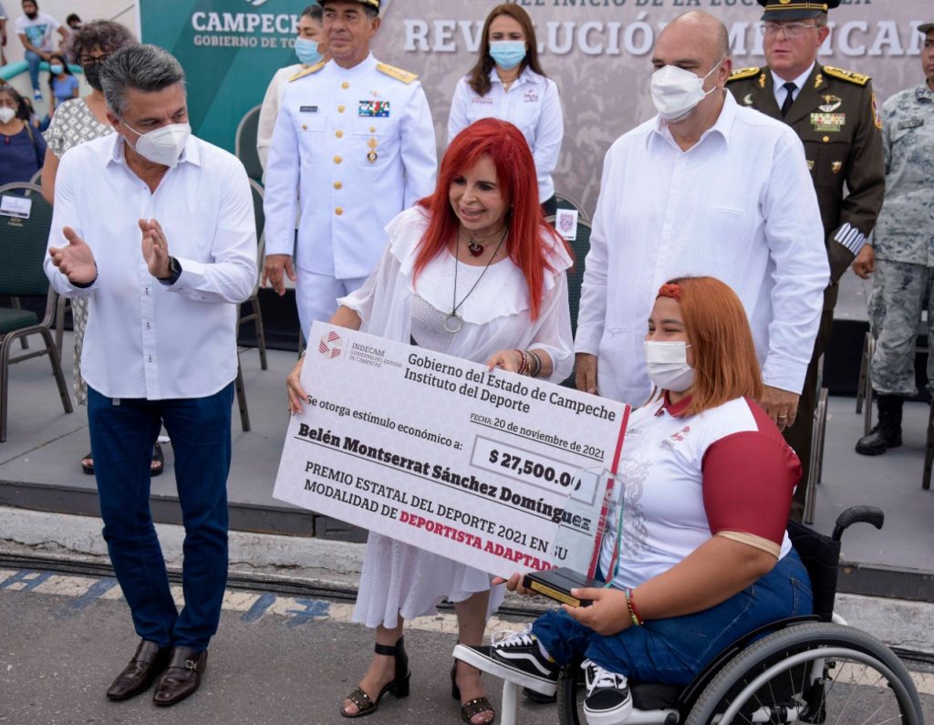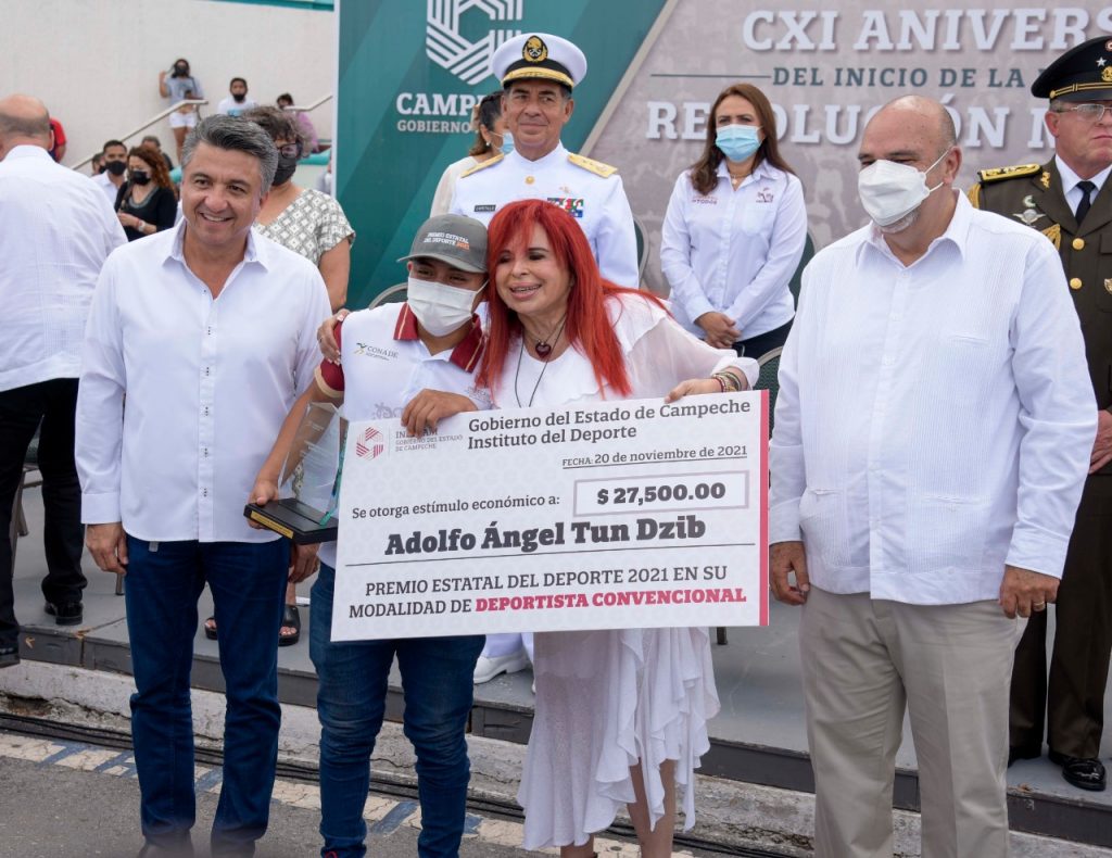 Desde un templete ubicado a la altura de Torres de Cristal, la Gobernadora hizo entrega de reconocimientos y estímulos económicos a Adolfo Ángel Tun Dzib, ganador del Premio Deportista del Año 2021, y a Belén Monserrat Sánchez Domínguez, ganadora del Premio de Deportista Adaptado 2021.