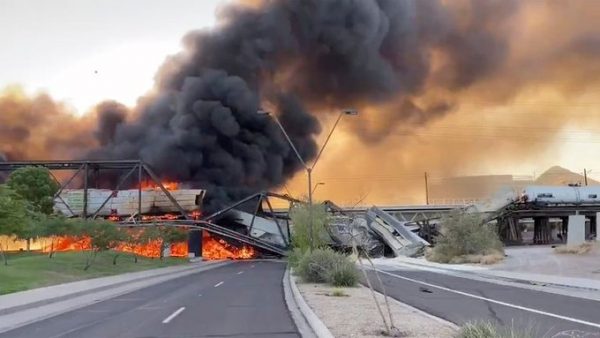 Un tren que se descarrilo, en el puente del Pacifico de Salt River Union, en Tempe, Arizona y por el impacto, varios vagones se quemaron,