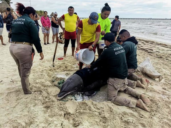 A.R. PROGRESO, 2/01/2023. —Tras ser atendido el delfín por elementos de la Policía Ecológica de Puerto Progreso, fue liberado en alta mar. Las autoridades municipales,