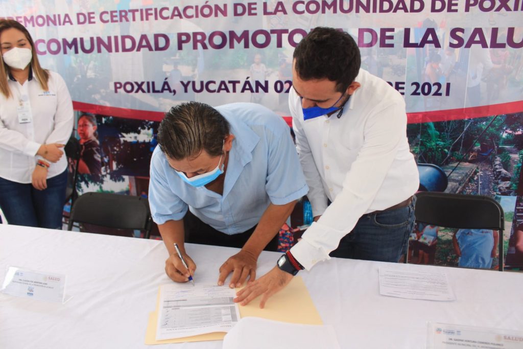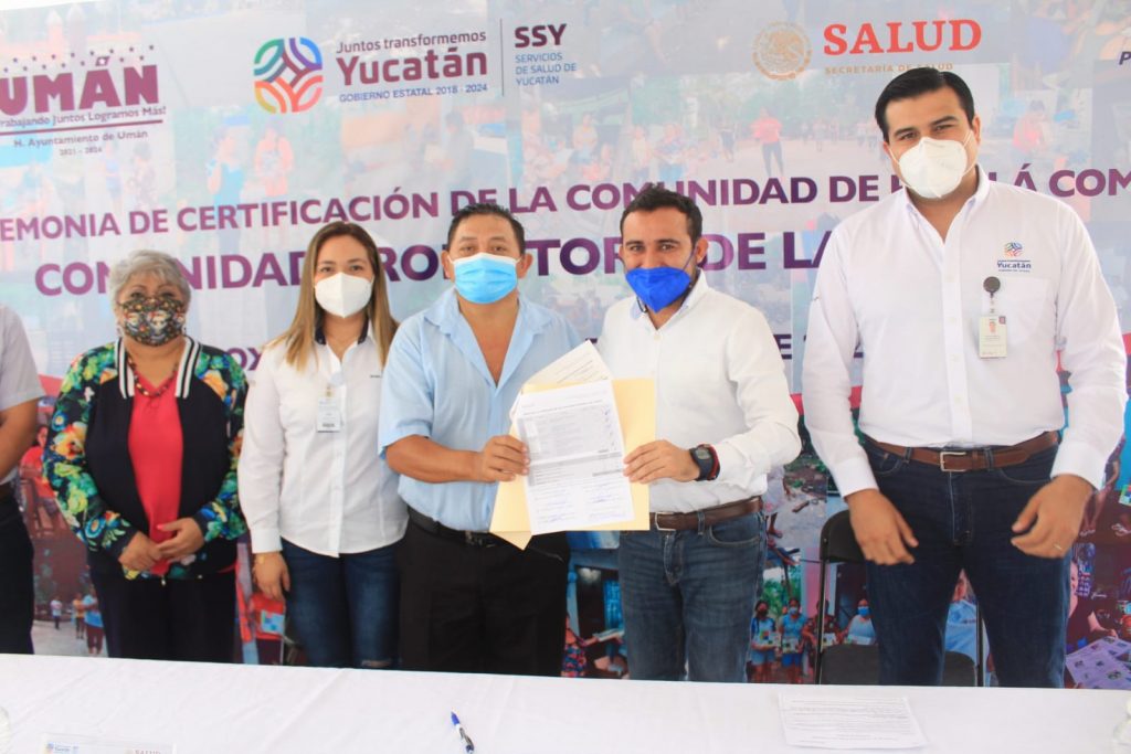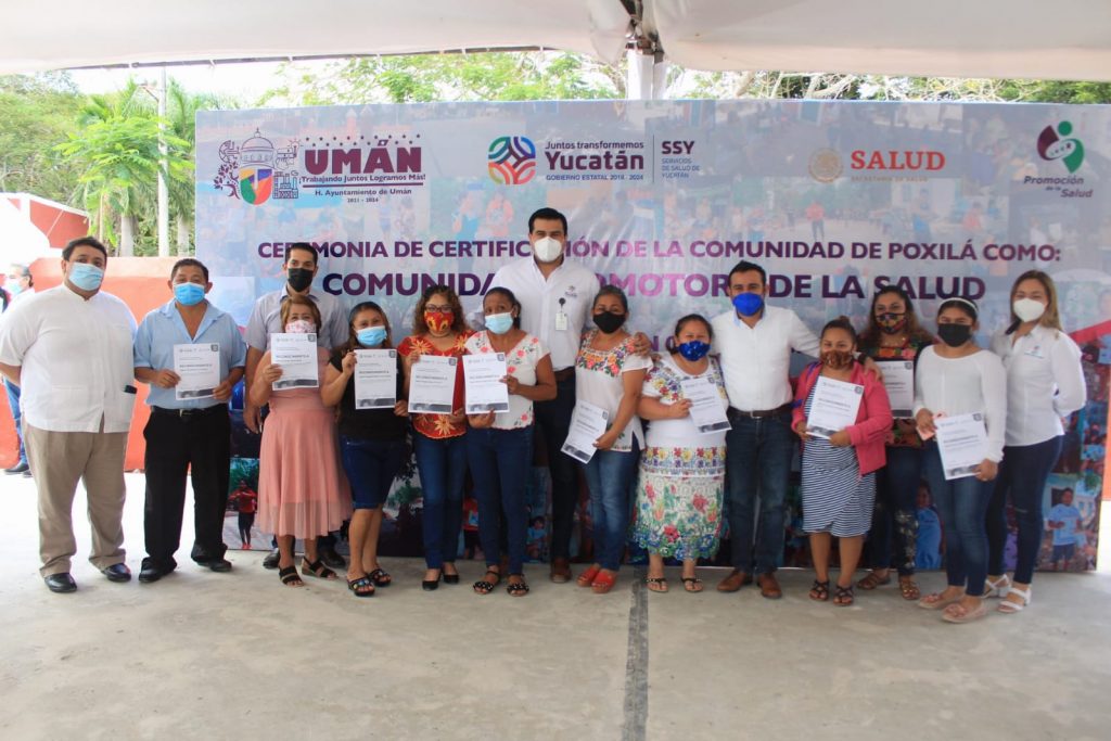 Yucatán, 2/12/2021. –Con la develación de una placa, la comisaría de Poxilá del municipio de Umán, quedó oficialmente acreditada como Comunidad Promotora de Salud y Entorno Saludable, esto de acuerdo a la estrategia sanitaria que implementa el Gobierno del Estado a través de la Secretaría de Salud.