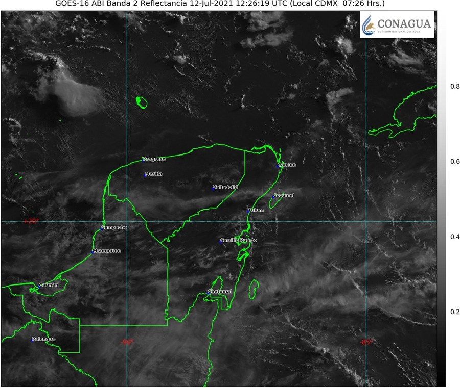 12/07/2021. — Península de Yucatán: Cielo medio nublado con chubascos acompañados de descargas eléctricas en la región. Ambiente fresco por la mañana y caluroso por la tarde. Viento del este con rachas de 50 a 60 km/h en zonas costeras.
