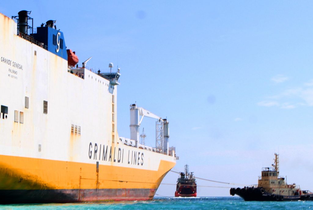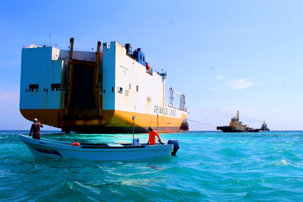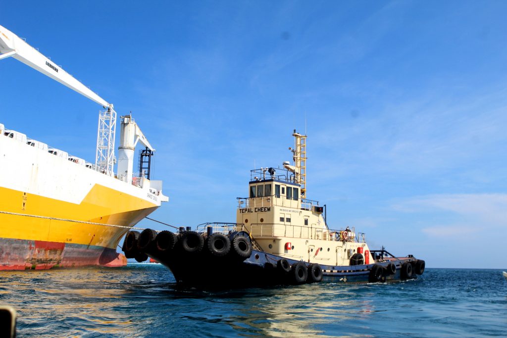 HUNUCMÁ, YUCATÁN, 01/08/2023. —Los trabajos para remover el buque mercante “Grande Senegal” comenzaron y se estima que, a la medianoche de este martes, ya este liberado y sea llevado al puerto de Progreso.