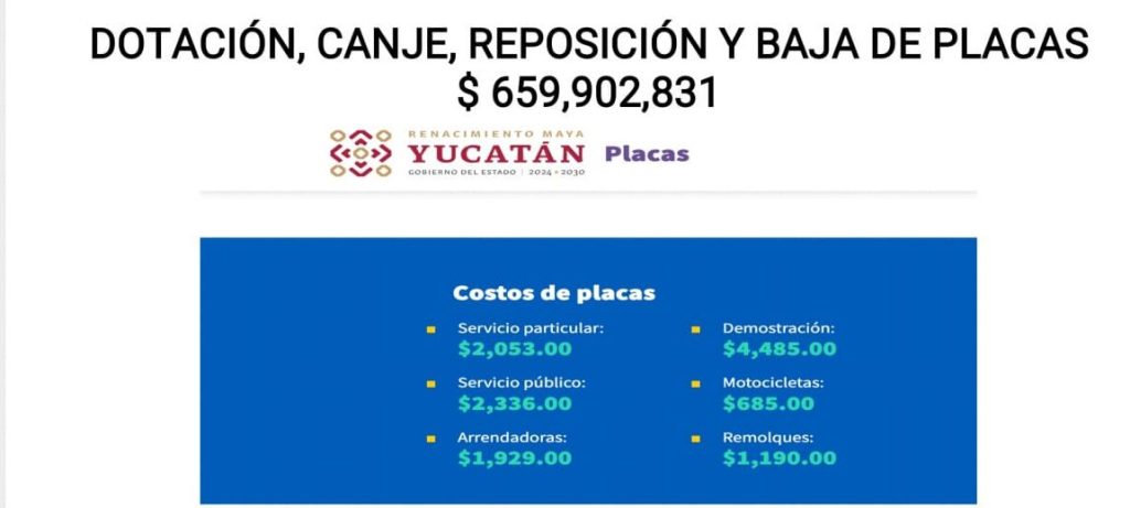 Cada placa de servicio particular tiene un costo de 2 mil 53 pesos; servicio público de 2 mil 336 pesos, arrendadoras de mil 929 pesos, demostración con un costo de 4 mil 485 pesos, remolques, mil 190 pesos y 685 pesos para motocicletas. El cambio de placas se realiza cada tres años; y las actuales vencen el 31 de diciembre.
