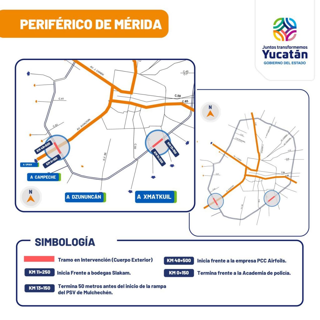 Además, se intervendrá el tramo de cuerpo exterior de esta arteria, que parte del kilómetro 48+500, localizado frente a la empresa PCC Airfoils, hasta el kilómetro 49+500, bajo el paso inferior vehicular de Umán.