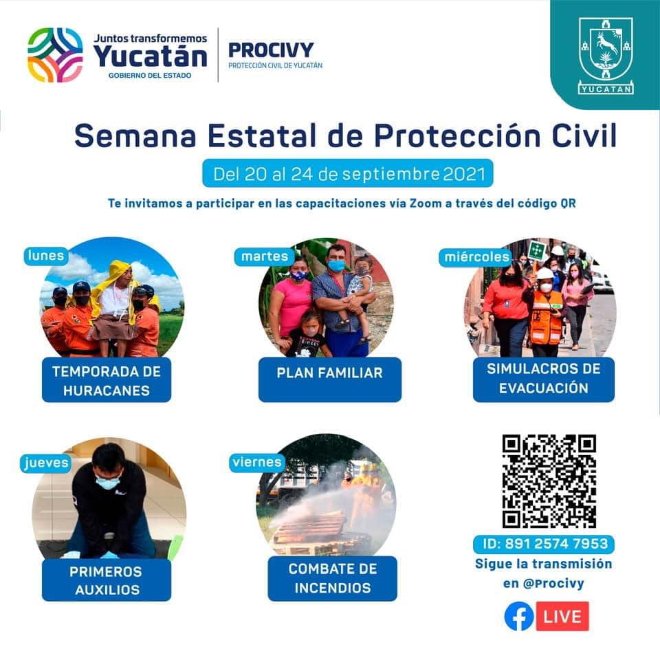 Mérida, Yucatán, 18/09/2021.- Con el propósito de saber qué hacer o cuáles medidas adoptar en caso de huracán, incendio u otra eventualidad, que ponga en riesgo a personas o bienes, la Coordinación Estatal de Protección Civil (Procivy) convocó a la población en general a participar en los talleres de capacitación en línea, del 20 al 24 del presente mes.