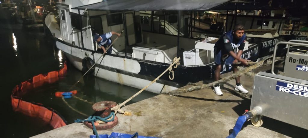 PROGRESO, 09/01/2023. —Un derrame de hidrocarburos y aguas sentinas que fueron derramadas al mar en el puerto de abrigo de Yucaltepen fue controlado y limpiada por elementos de la Secretaría de Marina Armada de México (SEMAR).