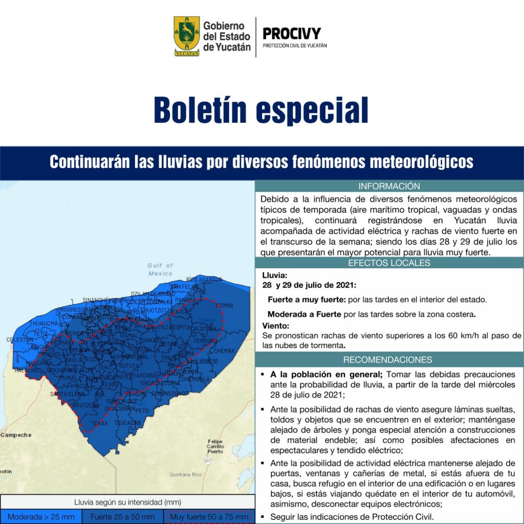 Mérida, Yucatán, 27/07/2021.- La Coordinación Estatal de Protección Civil (Procivy) alerta de potenciales lluvias intensas para este miércoles 28 y jueves 29 de agosto, ante la aproximación de diversos sistemas meteorológicos como aire marítimo tropical, vaguadas y ondas tropicales.