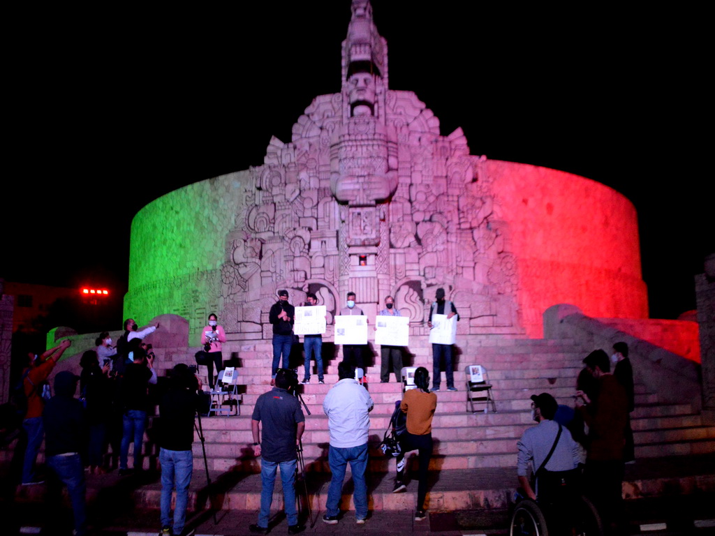 MÉRIDA, 14/02/2022. -En el monumento a La Patria que por momentos se “pintó de rojo”, periodistas nos manifestamos por las agresiones y homicidios en agravios de compañeros, en diferentes puntos de la República Mexicana, en recientes fechas.