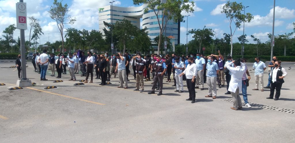 De manera semi presencial, con no más de 25 personas previamente elegidas en cada firma para el Simulacro, se procedió a la aplicación de medidas de desalojo, atención inmediata, primeros auxilios y otras acciones a emprender, en caso de siniestro o desastre natural, explicó.