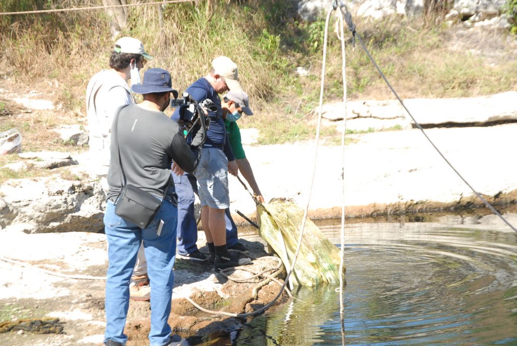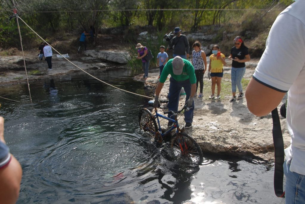 Tres buzos se introdujeron al fondo del cenote, sacando la bicicleta, luego una canasta metálica, luego una llanta para camión, y en costales, botellas de plástico; mientras que otras personas presentes levantaron la basura tirada alrededor del “ojo del agua”.