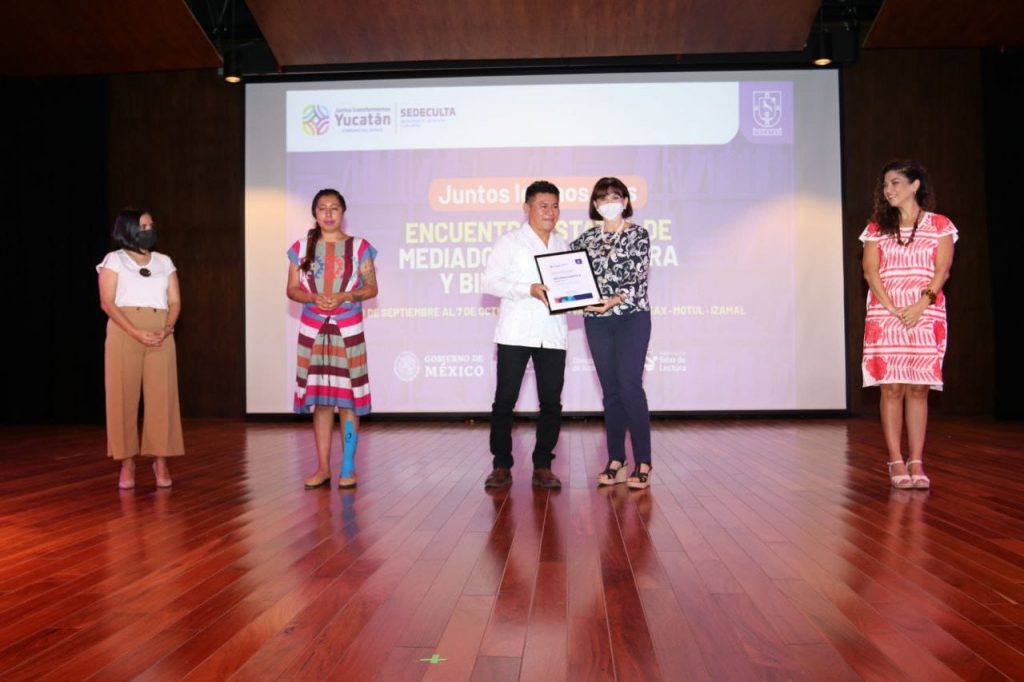 En este marco, se reconoció a Clotilde Moguel Medina, por 31 años en este ámbito y como coordinadora de la Red Estatal de Bibliotecas, y a Natalio Noh Kú, de Xocén, Valladolid, por su labor como promotor bilingüe de la lengua y cultura mayas, quien habló en representación de todas y todos sus compañeros.