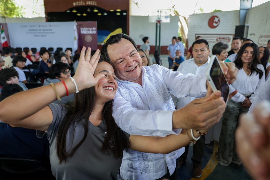 MÉRIDA, YUCATÁN, 07/05/2025. —El Gobernador Joaquín Díaz Mena, entregó a estudiantes de nuevo ingreso de la Preparatoria Federal por Cooperación “Miguel Ángel” la tarjeta de la beca universal de Educación Media Superior “Benito Juárez”, a través de la cual podrán recibir mil 900 pesos bimestrales durante todo el ciclo escolar y hasta por 30 meses.