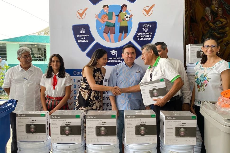Acompañado de la diputada local del Distrito V, Karla Salazar González y el director de la escuela sede Jorge Carlos Mugártegui López, se otorgaron los 27 paquetes que contienen: 1 proyector multimedia, 2 contenedores de basura, 5 cubetas de pintura blanca de 19 litros, 3 cubetas de pintura azul de 19 litros, 3 cubetas de impermeabilizante de 19 litros, así como 5 balones de futbol y 5 de basquetbol.