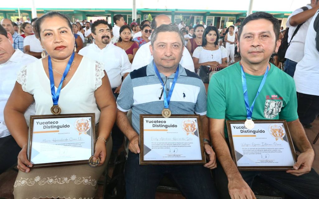 En el marco de este evento, se entregaron las medallas y reconocimientos de “Yucateco Distinguido” al maestro Wilgen Efraín Interián Pérez, el docente Fredy Abraham Hernández Solís y la madre de familia María Hermelinda Ciau Uc.