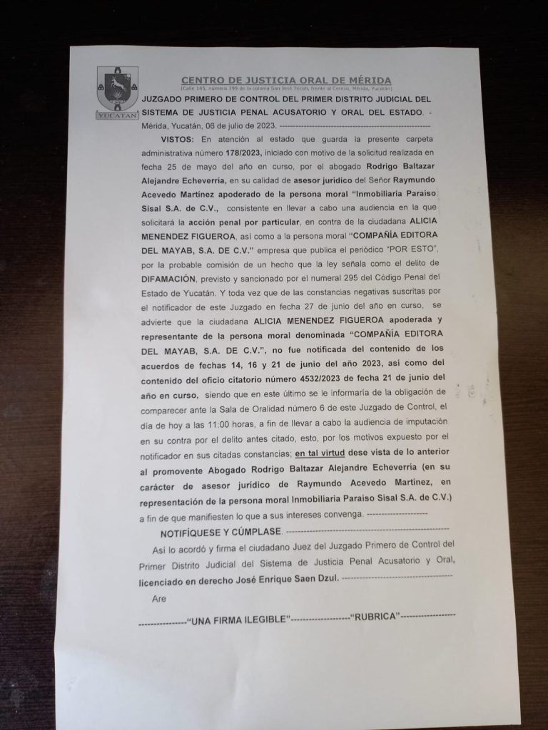 En la sala 6 del Centro de Justicia Oral de Mérida (Cejom), estaba programada para este jueves, a las 11:00 horas, la audiencia con la directora de Por Esto!, Menéndez Figueroa, por el delito de difamación que hay en su contra, de acuerdo con la denuncia interpuesta por los empresarios de Paraíso Sisal, pero minutos antes, al representante jurídico de Paraíso Sisal, Rodrigo Baltazar Alejandre Echeverría, se le avisó la cancelación del evento.