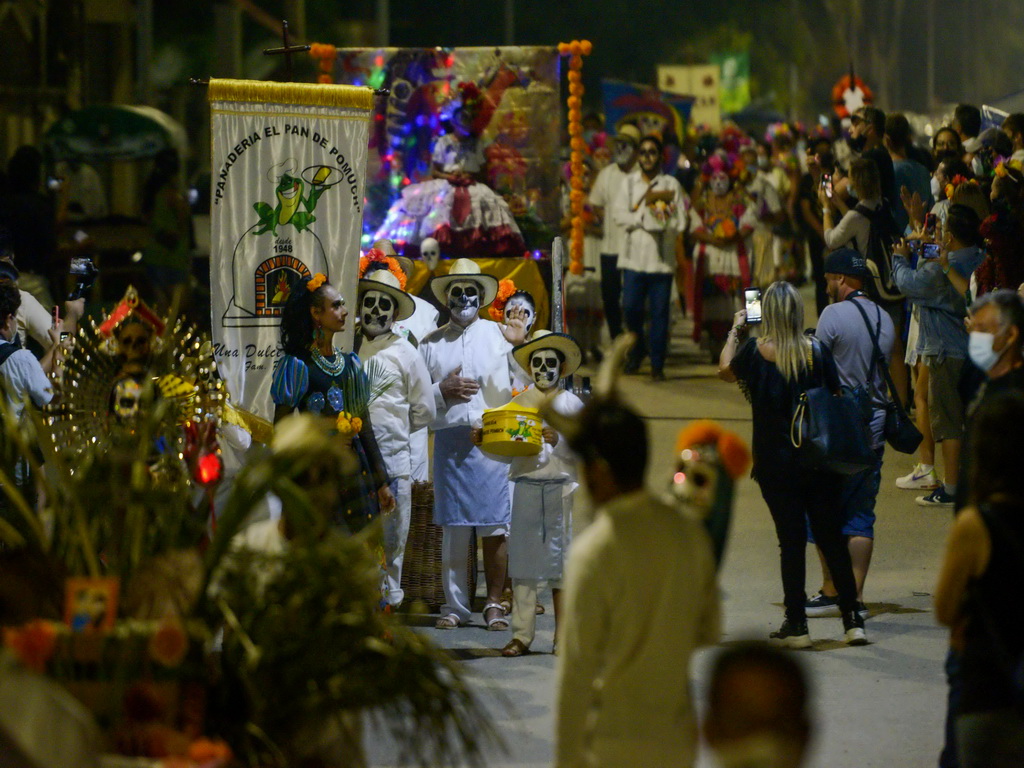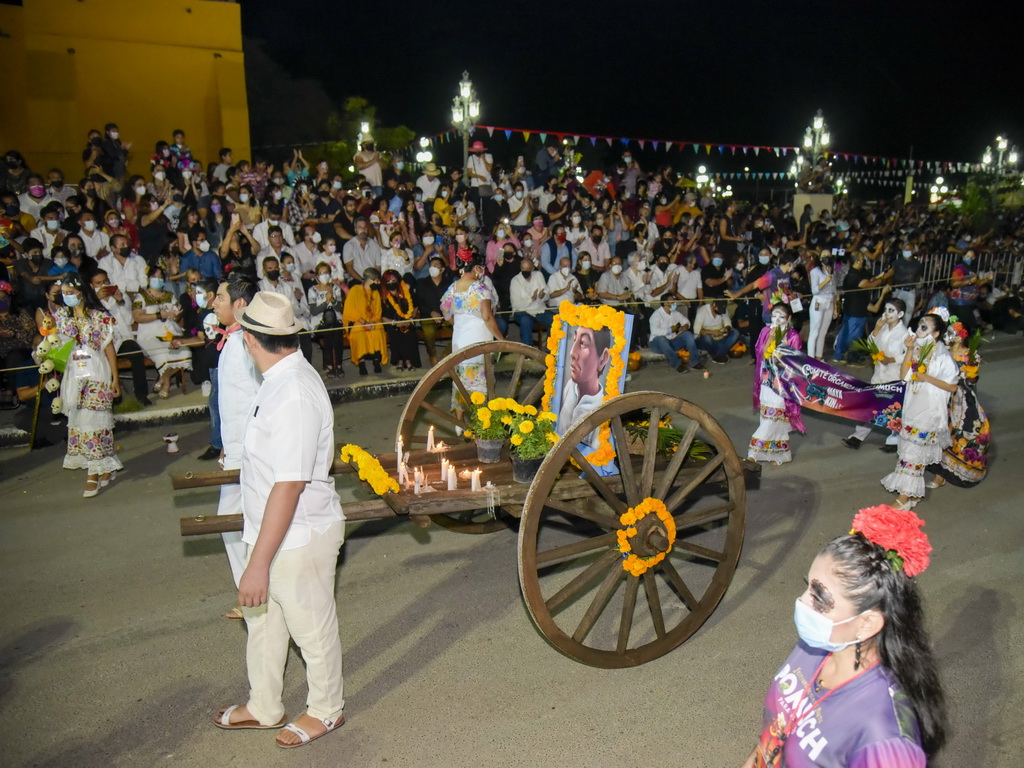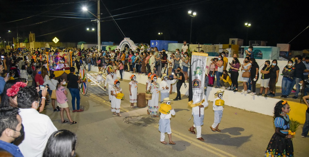 Por más de una hora, los participantes caminaron sobre la avenida principal de Pomuch, desde el cementerio hasta el parque principal, acompañados por niños vestidos de calaveras tocando silbatos como un llamado a las ánimas en su día, y mujeres con flores y ofrendas caminando en silencio detrás de una carroza adornada con flores de cempasúchil y velas, que en el centro llevaba la foto de Jacinto Canek, líder indígena maya de raza, quien encabezó una rebelión por el dominio político y religioso de los mayas en Yucatán.