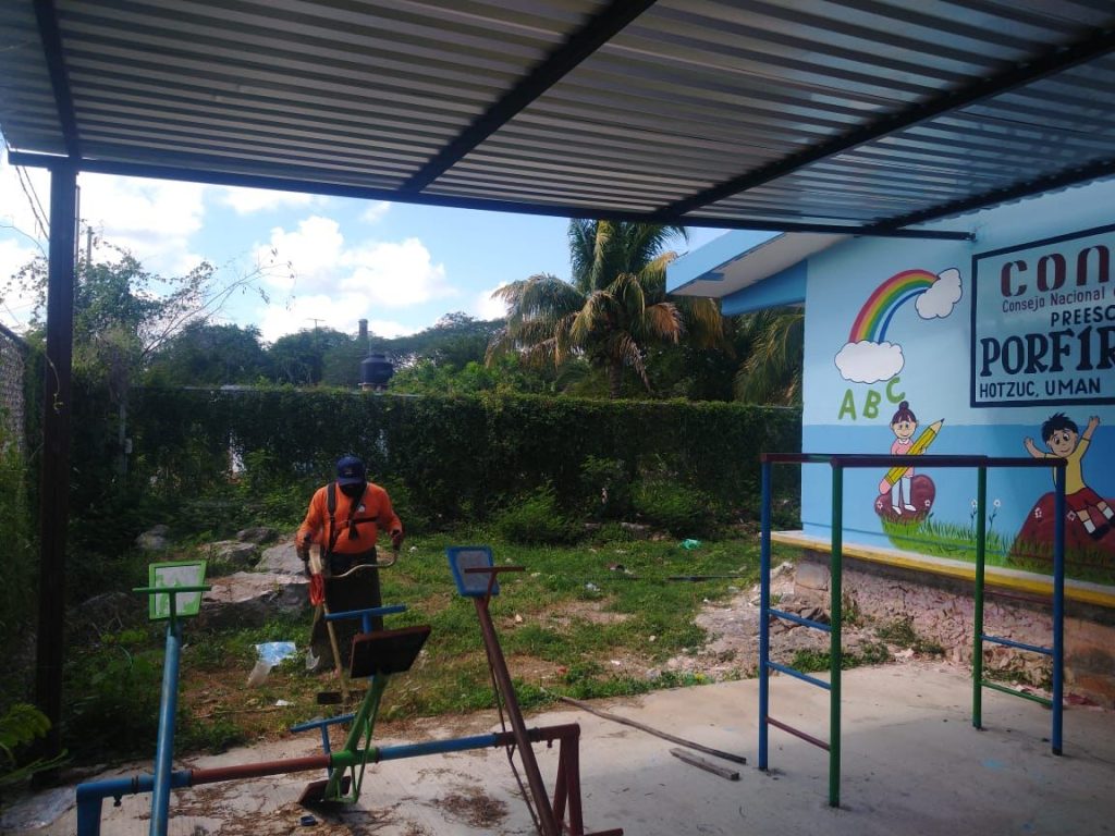 Cumpliendo con la encomienda del Presidente Municipal de Umán, Dr. Gaspar Ventura Cisneros Polanco, se continúa brindando atención integral en los planteles educativos con los servicios de fumigación, desbroce, recoja de basura, poda de árboles, limpieza, entre otros servicios.