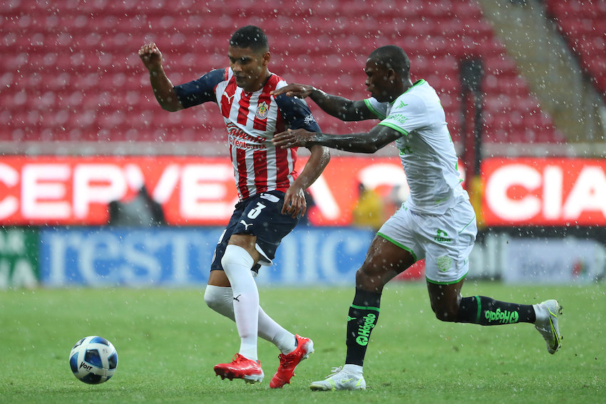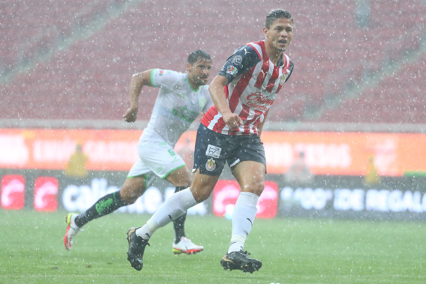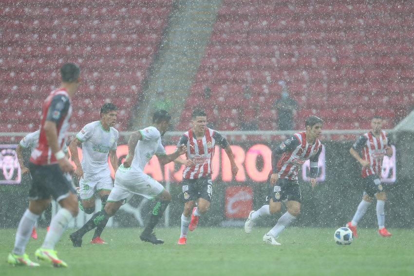 07/08/2021. GUADALAJARA. –El Rebaño Sagrado tuvo que remar contra corriente, y también literalmente contra el agua debido a la torrencial lluvia que cayó durante el segundo tiempo, y sobre el final del partido pudo rescatar un punto en casa al empatar a 2 con FC Juárez la tarde de este sábado, en duelo de la fecha 3 del Torneo de Apertura 2021.