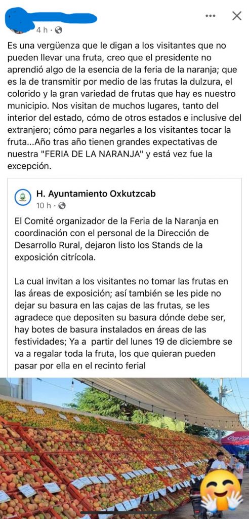 “Es una vergüenza que le digan a los visitantes que no pueden llevar una fruta, creo que el presidente no aprendió algo de la esencia de la Feria de la Naranja; que la transmitir por medio de las frutas la dulzura, el colorido y la gran variedad de muchos lugares, tanto del interior del Estado, como de otros estados e inclusive del extranjero; como para negarles a los visitantes tocar la fruta… año tras año tiene grandes expectativas de nuestra “Feria de la Naranja” y está vez fue la excepción”, escribió.