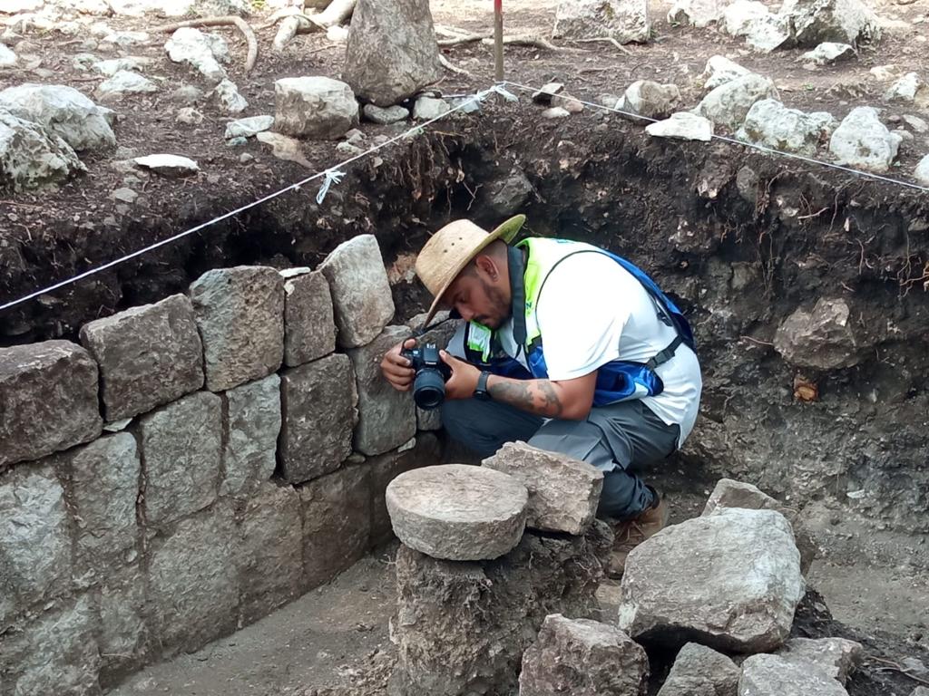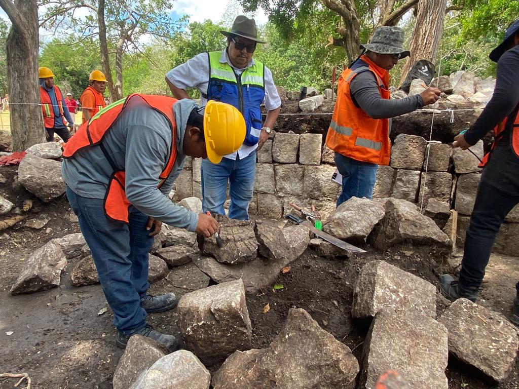 Chab Cárdenas mencionó que la piedra fue encontrada durante las excavaciones en el Juego de Pelota de Casa Colorada por la arqueóloga Lizbeth Mendicuti Pérez, dentro del conjunto, una estructura que se anexa al basamento del templo de Maudslay.
