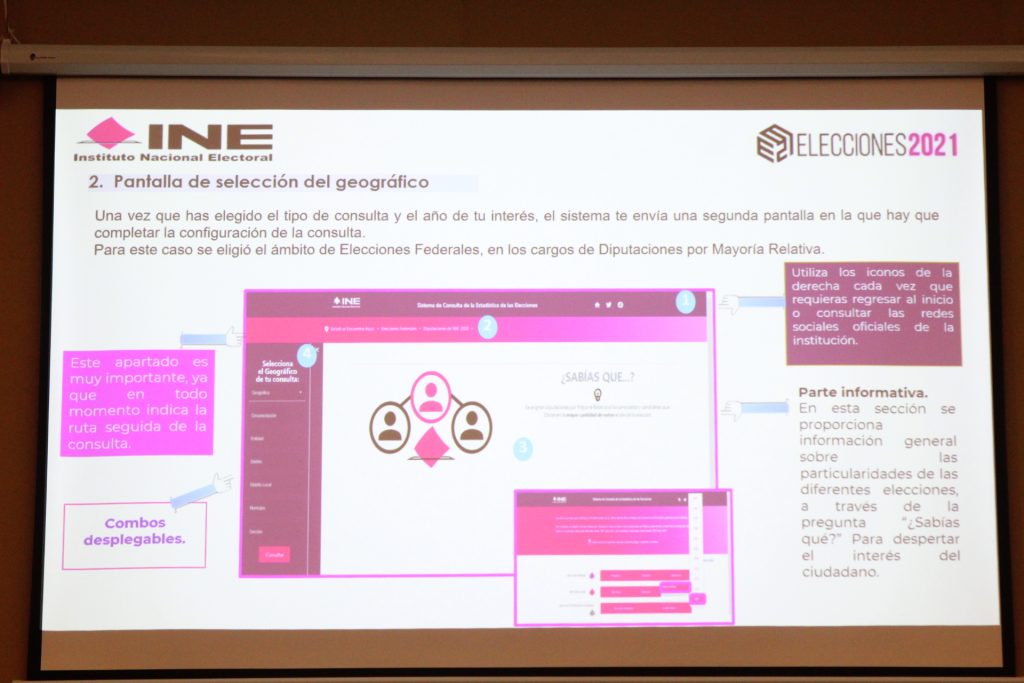 En su oportunidad, la vocal Ejecutiva de la 02 Junta Distrital, Licda. Rebeca Ancona López recordó que el Sistema de Consulta se ubica en un sitio web que integra la Estadística Electoral Nacional con los resultados de las elecciones federales (de 1991 al 2021) y locales (de 2015 al 2022), para ponerlos a disposición de la ciudadanía, los partidos políticos, la academia y otros actores políticos, ingresando a https://siceen21.ine.mx/.