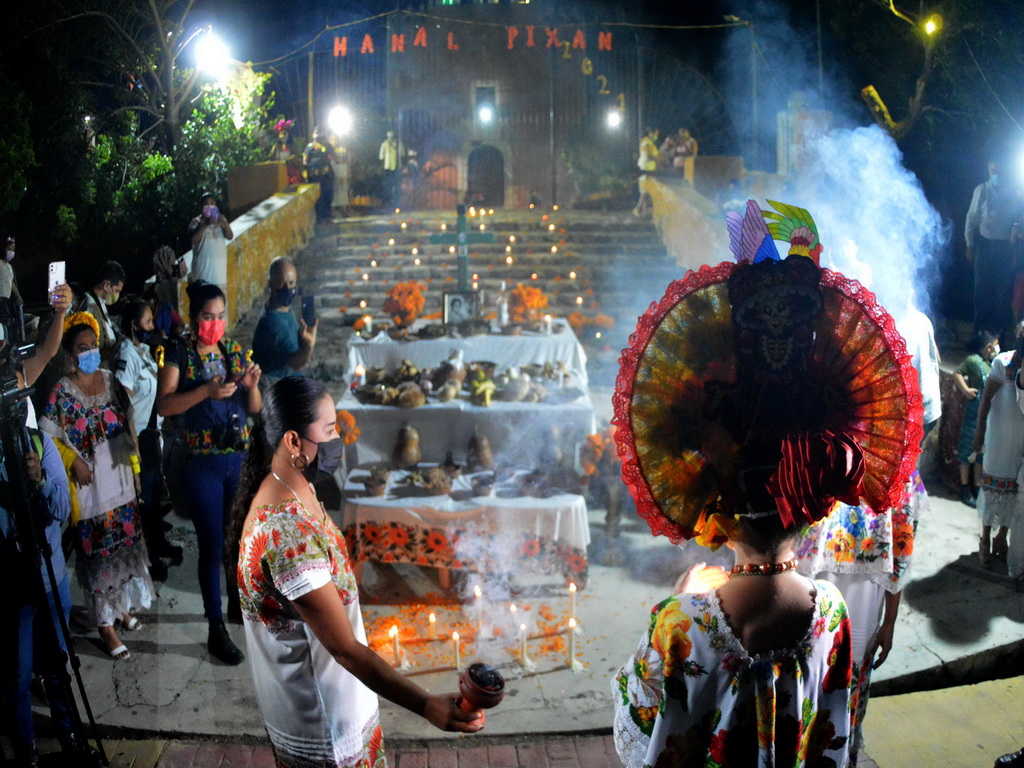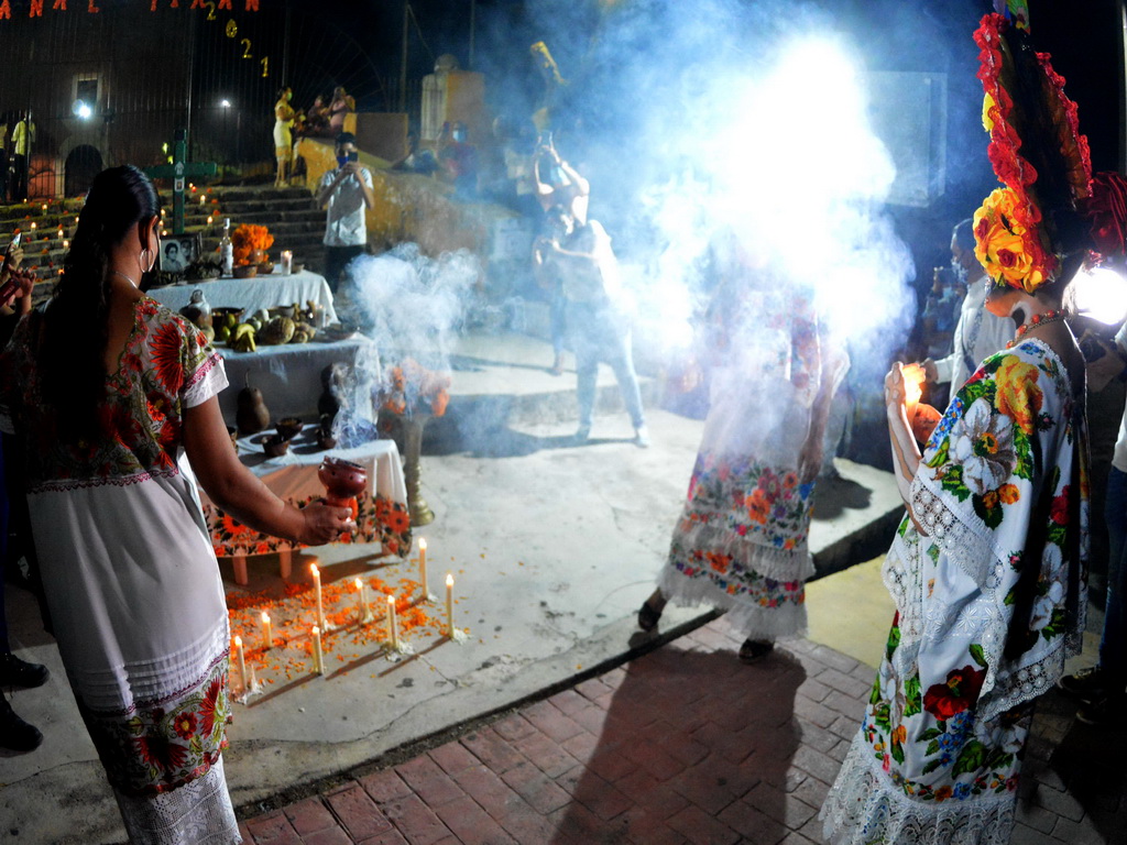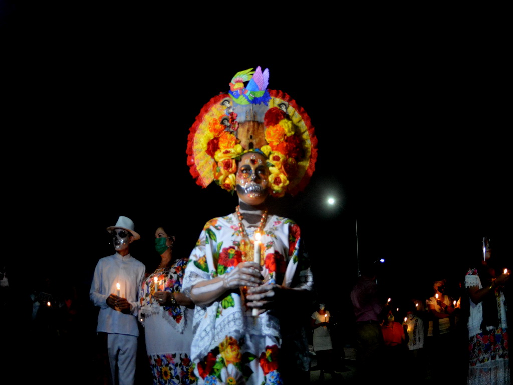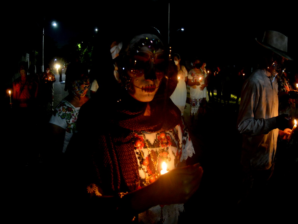 30/10/2021, YUCATÁN. –Las ánimas salieron del cementerio de Homún y llegaron hasta la iglesia del pueblo pasando por altares de muertos, en una noche mística y llena de colorido.