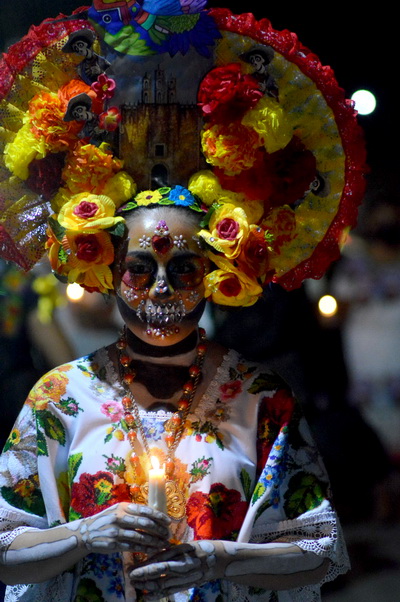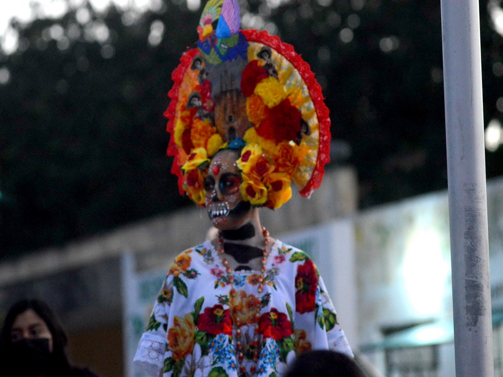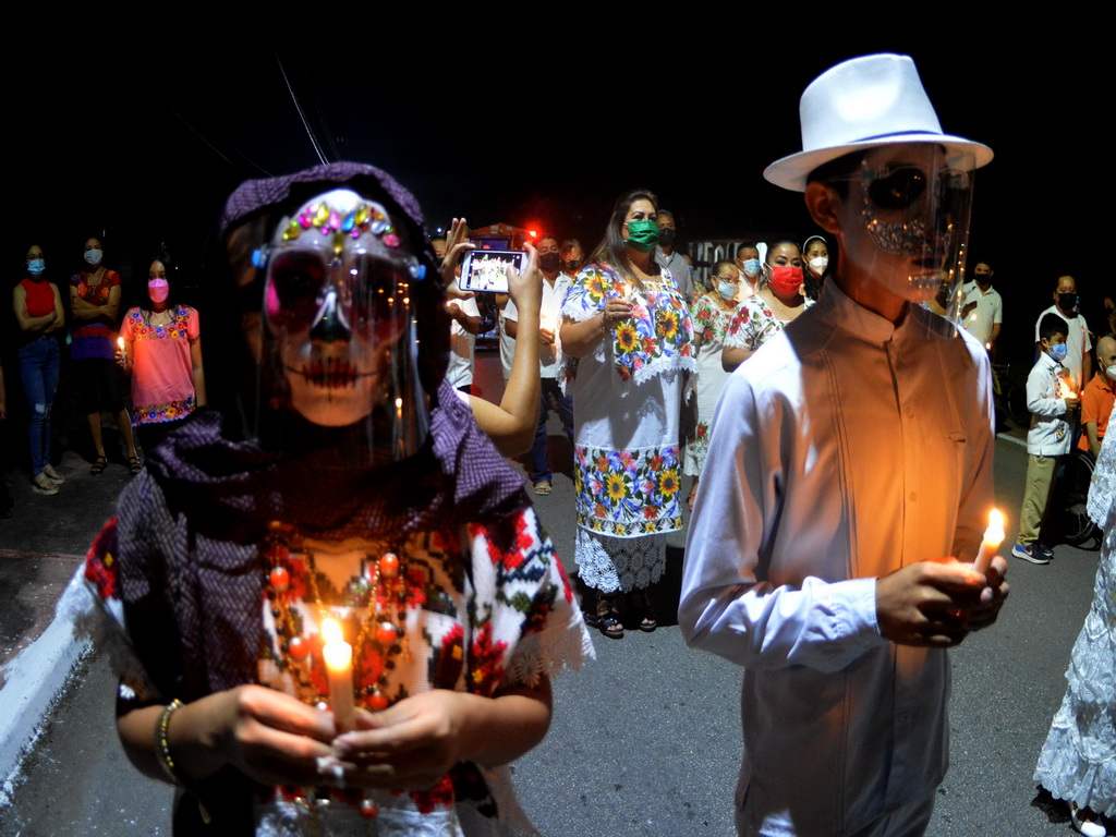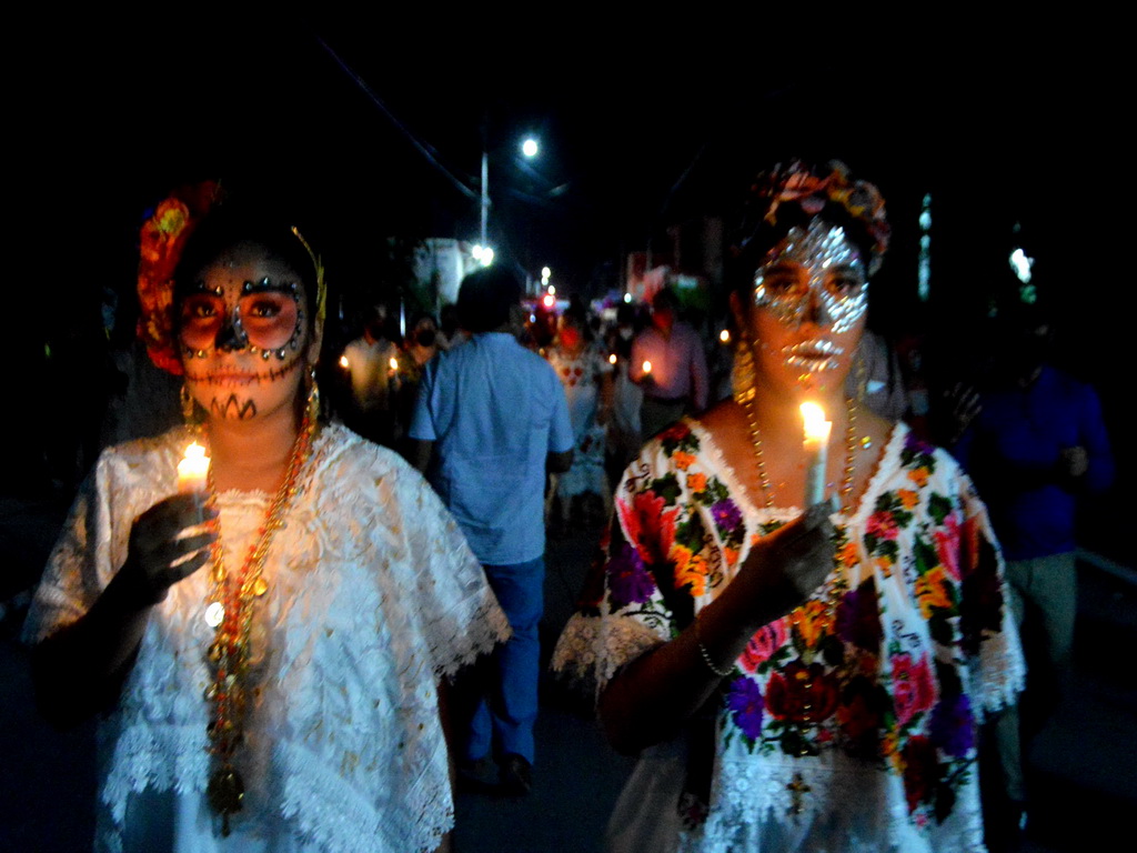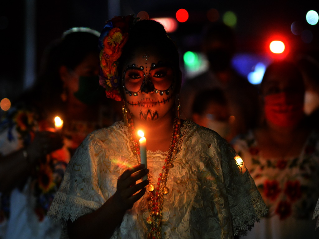 30/10/2021, YUCATÁN. –Las ánimas salieron del cementerio de Homún y llegaron hasta la iglesia del pueblo pasando por altares de muertos, en una noche mística y llena de colorido.
