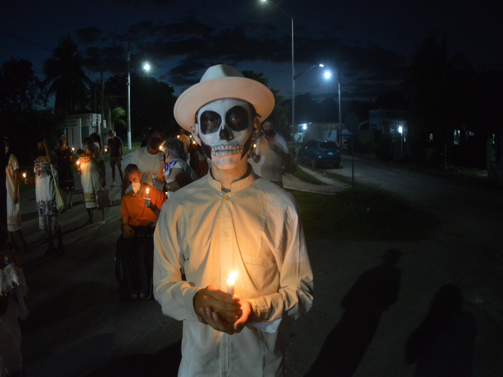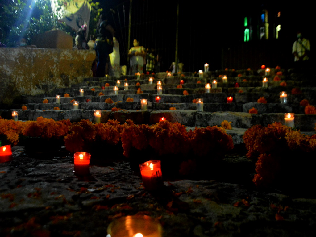 Tras más de media hora, las ánimas y seres vivos, llegaron a las escaleras del templo, dónde estaba un altar de muertos, en honor a todos los fallecidos que la comunidad conocida por sus bellos cenotes de agua verde esmeralda y azul turquesa.