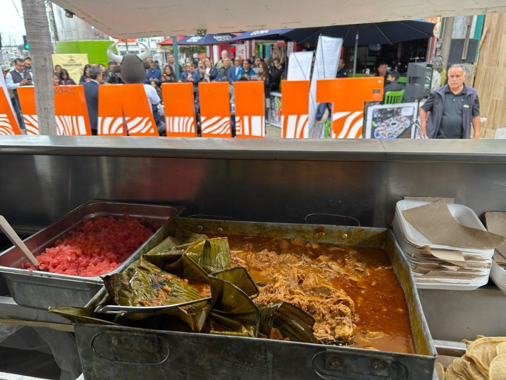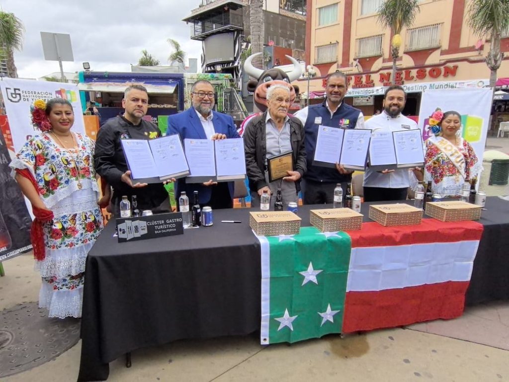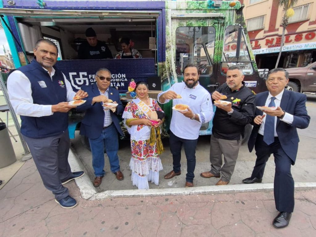 TIJUANA, BAJA CALIFORNIA, 25/04/2025. —Con la firma del acta de hermanamiento de península a península con el Clúster Gastro Turístico de Baja California, la Federación Gastronómica de Yucatán, inició sus actividades en el marco de la 49.ª edición del Tianguis Turístico de México en Tijuana, donde arribó con el “YucaTruck”, ofreciendo los sabores de Yucatán con deliciosos tacos de cochinita pibil.