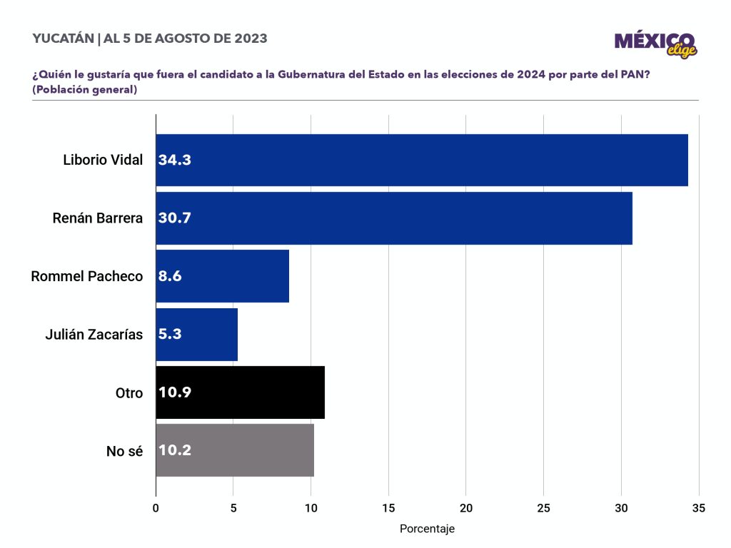 A las mismas personas les preguntaron quién le gustaría que fuera en candidato al Gobierno del Estado por el PAN; y aparece nuevamente Liborio Vidal, con 34.3 puntos, Renán Barrera, con el 30.7 y Rommel Pacheco, con  8.6 puntos. La misma cuestión, pero por Morena, aparece Joaquín Díaz Mena, con 28.4 puntos.