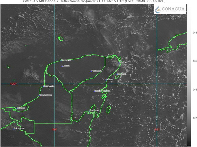 02/06/2021. –Península de Yucatán: Cielo medio nublado con lluvias aisladas vespertinas en la región. Ambiente cálido por la mañana y caluroso por la tarde. Viento del este y noreste de 15 a 30 km/h.