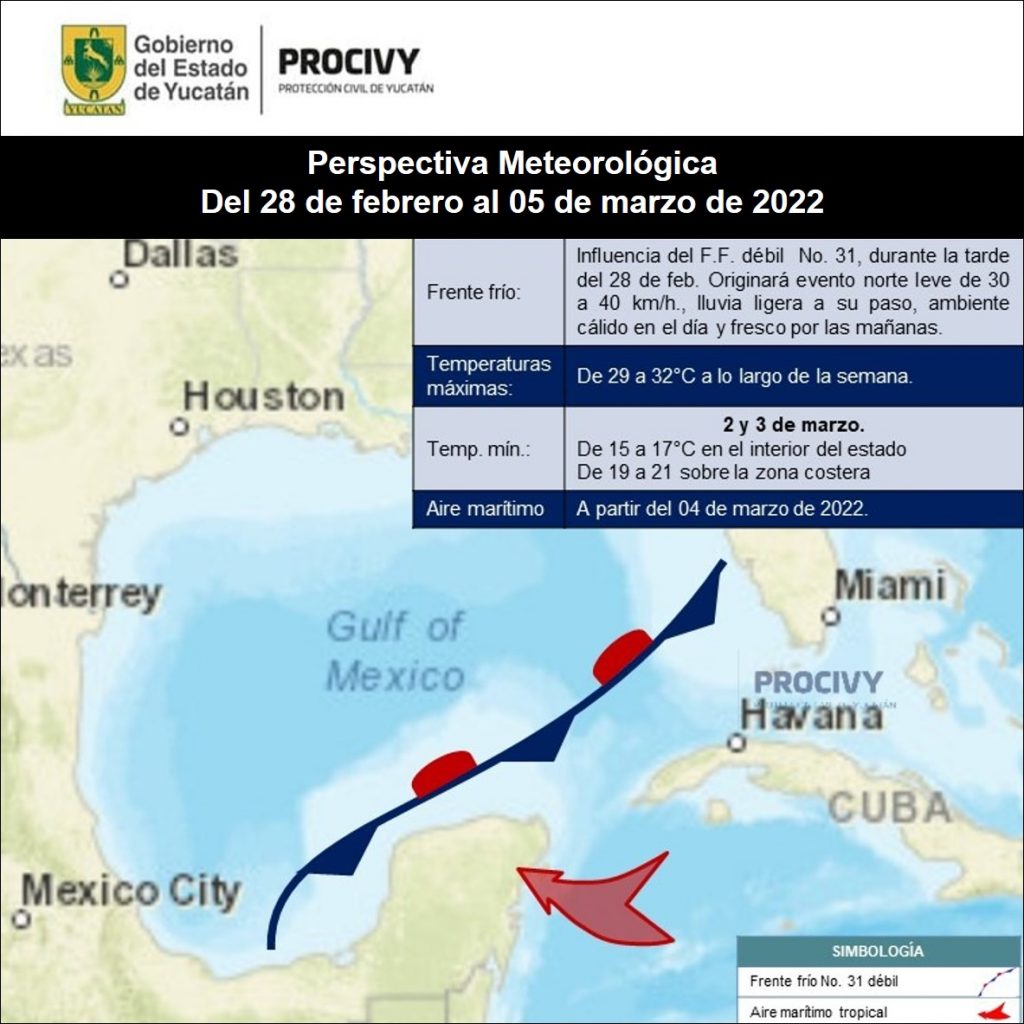 Mérida, 27/02/2022.- Con leve descenso de temperatura, acompañado de evento norte de hasta 30 km/h y lluvias ligeras, se esperan mañana los efectos de un débil frente frío a territorio yucateco, el No. 31, informó la Coordinación Estatal de Protección Civil (Procivy).