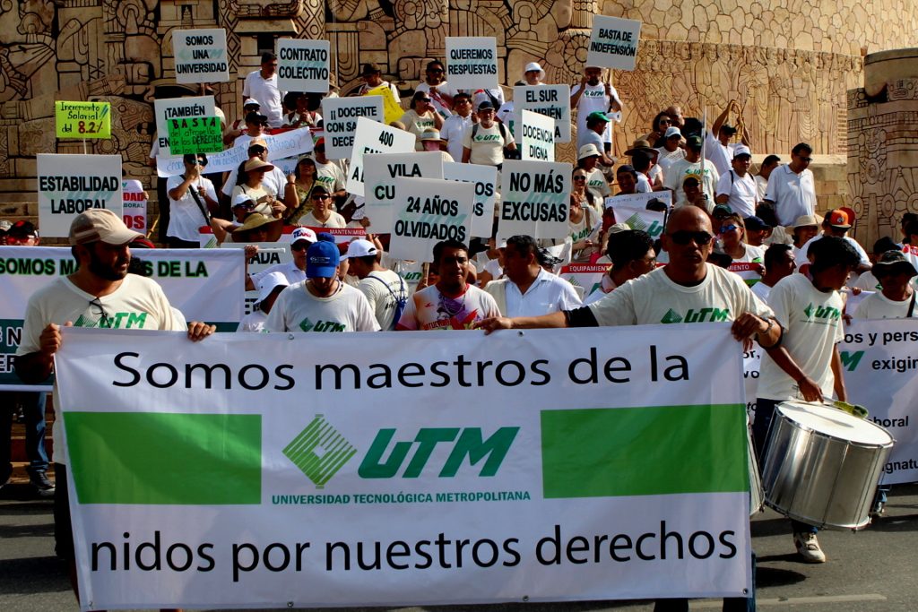 Gabriel Cabañas Marrufo, explicó en voz del colectivo: “ya desde hace varios años, nos han quito algunos derechos que tenemos por ley, y algunos no, nos han dado, hay maestros con más de 20 años de servicio de la UTM, no tienen base, no tienen seguridad social, no cuentan con ninguna prestación, también los profesores de asignatura que, si tienen, una base, si, se les ha recortado los derechos, no hay un sindicato que avale y proteja al estado”.