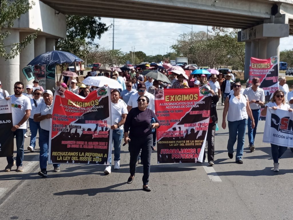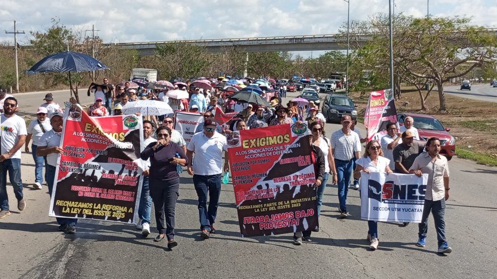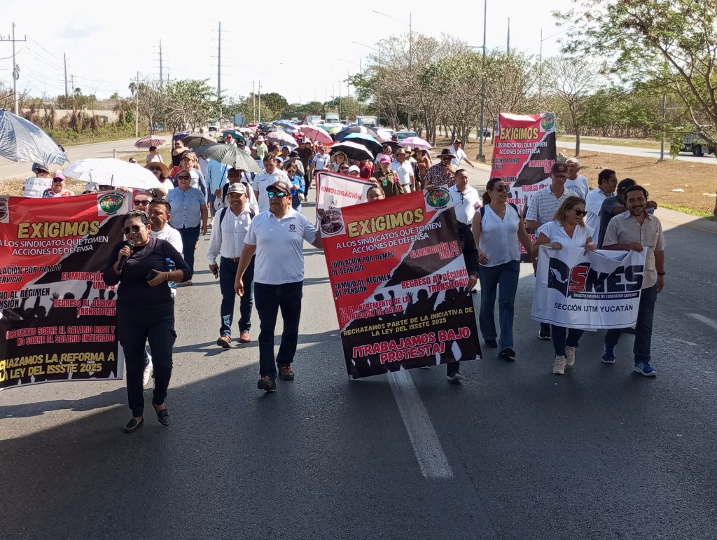 MÉRIDA, YUCATÁN, 28/02/2025. —Unos 300 maestros y afiliados al Instituto de Seguridad y Servicios Sociales de los Trabajadores del Estado (ISSSTE) se manifestaron por la ley, asegurando que afecta sus derechos laborales, económicos, sociales y en el futuro su pensión; así, como su jubilación estaría afectada.