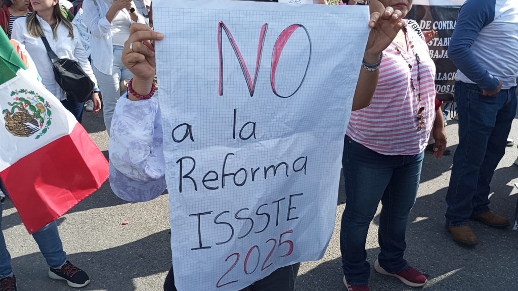 “Esa ley del ISSSTE hasta el momento está afectado nuestros derechos, porque habla ahí de un descuento de personas que ganen más de 10 UMAs, esto quiere decir más de 34 mil pesos, nos comentan que esto no va a proceder que fue un error de redacción, pero, mientras eso este ahí en papel.”