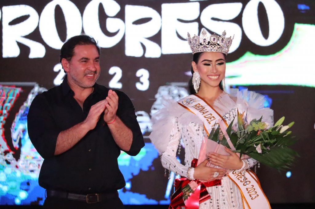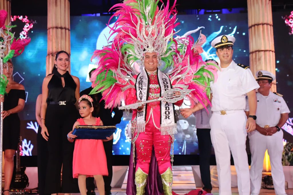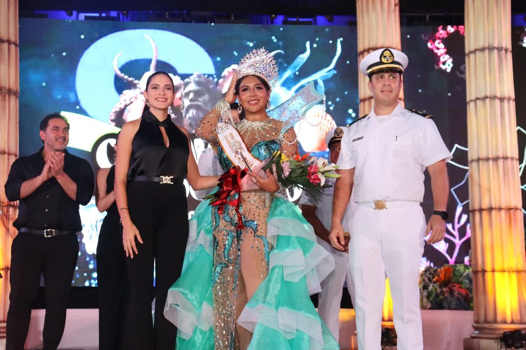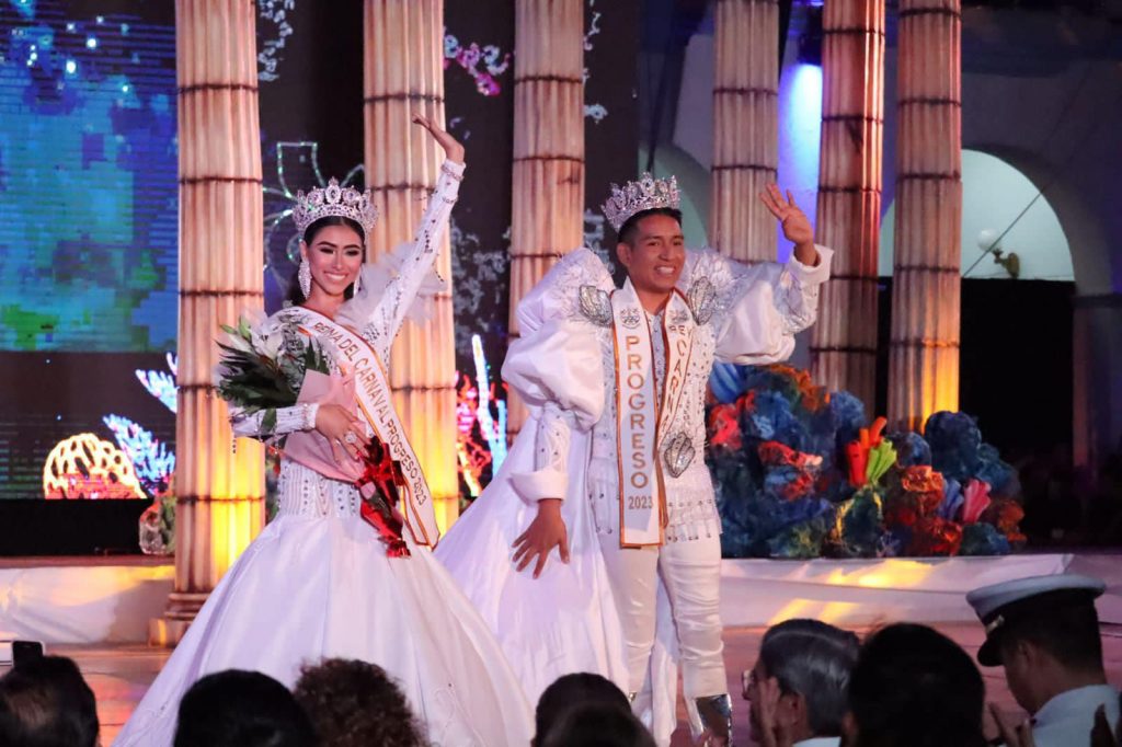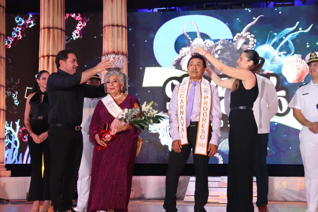 Enseguida, la presidenta del Comité del Carnaval, Alejandra Castilla Blanco y el Capitán Regional de Puerto Progreso, teniente de corbeta Alfredo Caballero Portugal, colocaron la banda y entregaron el báculo al Gobernador de las carnestolendas, Carlos Wilfredo Carrillo Avalos, y corona a la Reina de la Diversidad, Alejandra Amairany Pérez Quijano.