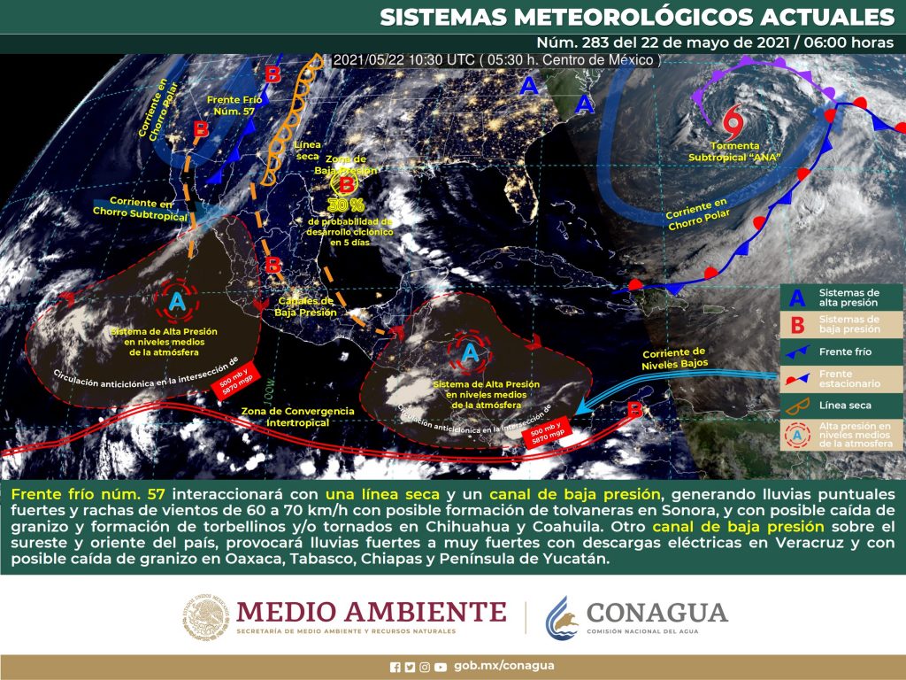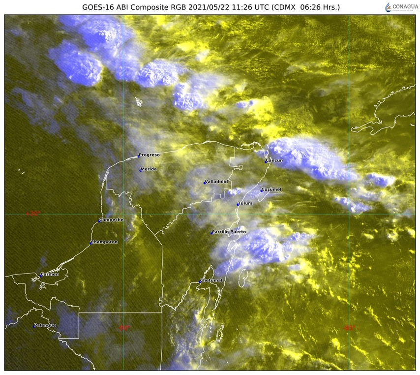 22/05/2021. – Península de Yucatán: Cielo medio nublado a nublado durante el día, con lluvias puntuales intensas en Yucatán y Quintana Roo, además de lluvias puntuales muy fuertes en Campeche, todas acompañadas de descargas eléctricas y posible caída de granizo en Yucatán y Quintana Roo. Ambiente fresco por la mañana y caluroso por la tarde. Viento del este de 20 a 35 km/h en la región con rachas de 50 a 60 km/h en zonas de Campeche y Yucatán.